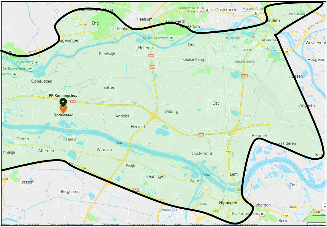 Woon jij in onderstaand gebied en wil je graag advies bij jou thuis? Dat kan! Een deskundige adviseur van PK komt bij jou langs! Er kunnen verschillende modellen schoenen buiten worden getest. Weet je al precies welke schoenen je wilt hebben? Ook dan komen we ze graag bij je bezorgen.